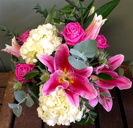 A luxurious scented, stargazer bouquet mingled with pink aqua roses and large headed, deep cream hydrangeas.