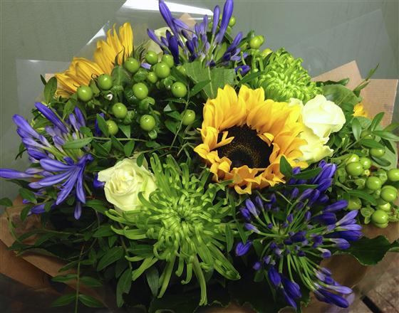 Vibrant sunflowers, roses, agapanthus and green blooms with hypericum berries make a striking bouquet!