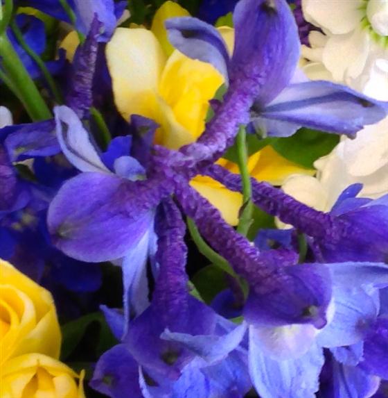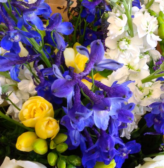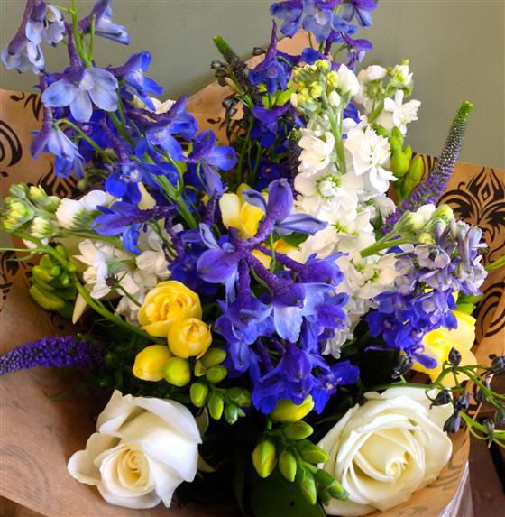 Blue delphiniums, white stocks and roses are highlighted with a touch of golden, scented freesia. A summer beauty.