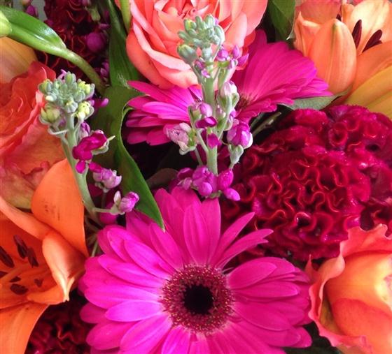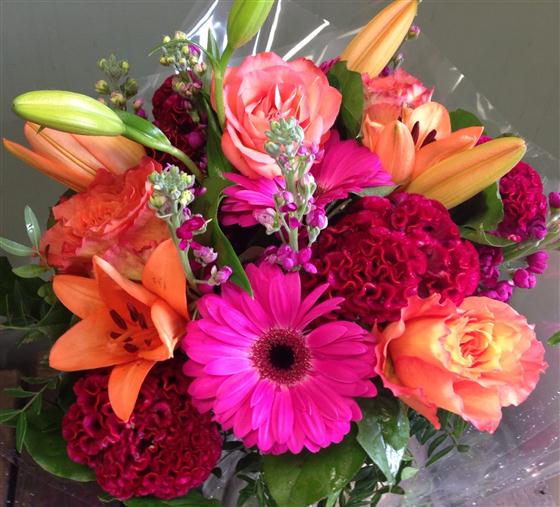 A magnificent hand-tied bouquet of vibrant, hot pink gerberas, celosias and stocks mingled with orange lilies and roses.