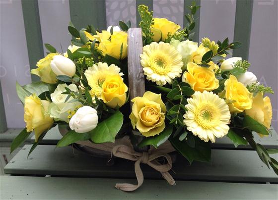Beautiful rustic basket arrangement with a cheerful selection of yellow seasonal flowers including roses.