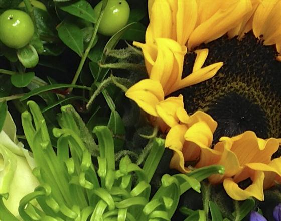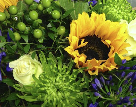 Striking sunflowers, agapanthus and white roses mingled with zesty lime blooms. A popular choice.