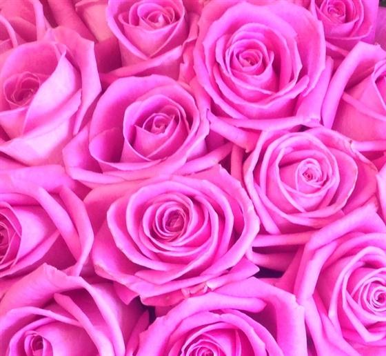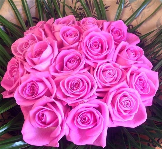 A massed bouquet of 18 aqua pink roses, skirted with foliage. For an extra special gift select 24 roses.