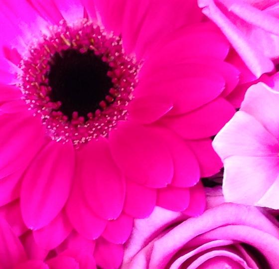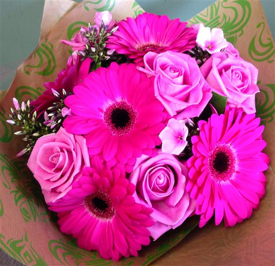 For an immediate impact this choose this striking bunch of hot pink gerberas, aqua roses and phlox.