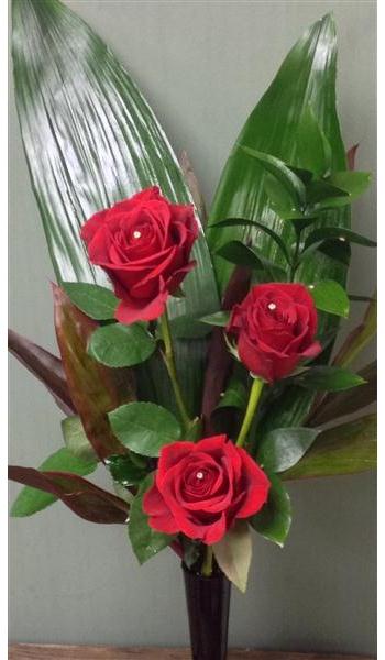 Trio of freedom roses with mixed foliage. Delivered in a black vase.