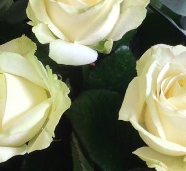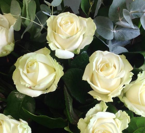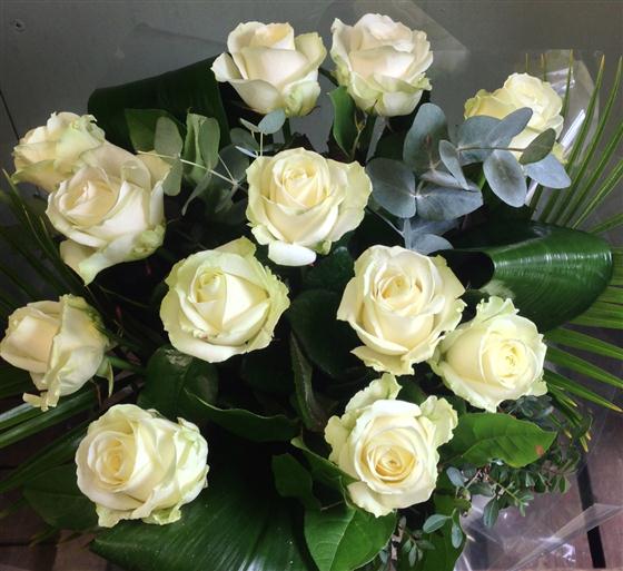 A dozen classic white roses combined with mixed foliage including aspidistras, eucalyptus and palm.