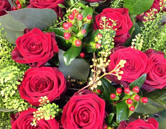 Two dozen top quality velvety red roses interspersed with berries and thalaspi foliage. The best you can buy!