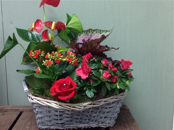 Large planted basket with mixed indoor flowering plants and a single red rose.