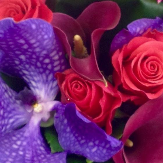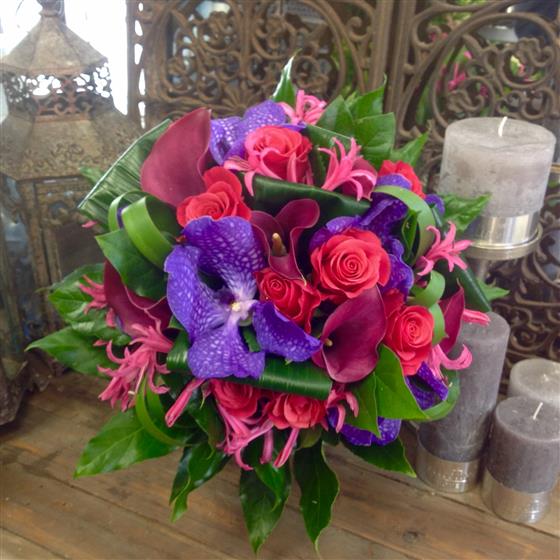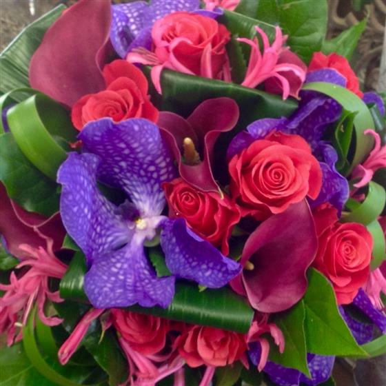 This is a really stylish excitinvibrant bouquet including roses, calla lilies and vanda orchids.
