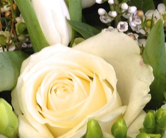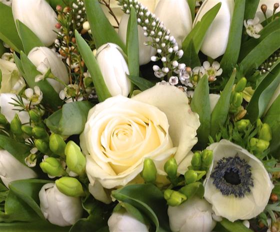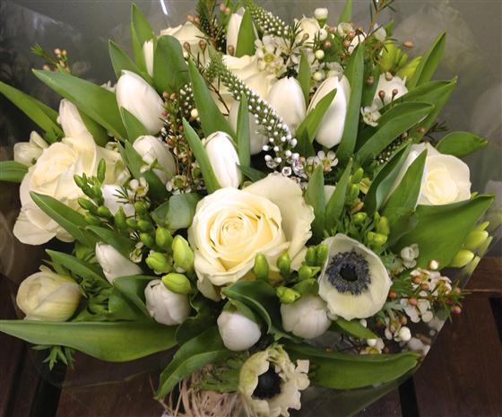 A spring blend of white blooms including anemones, roses, tulips, veronica and delicate wax flower.