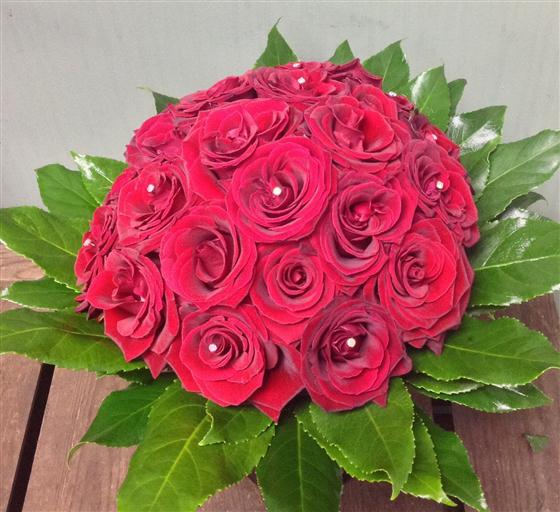 24 stunning luxury velvety red roses in a massed bridal style, delivered in a complimentary vase.