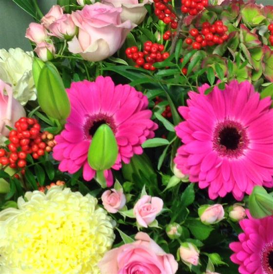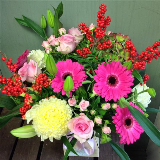 A splash of colour, winter berries combined with roses, gerberas and lilies to make a magnificent bouquet.
