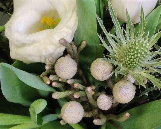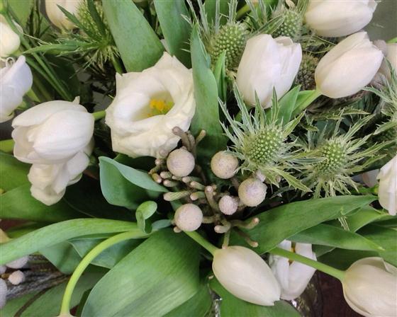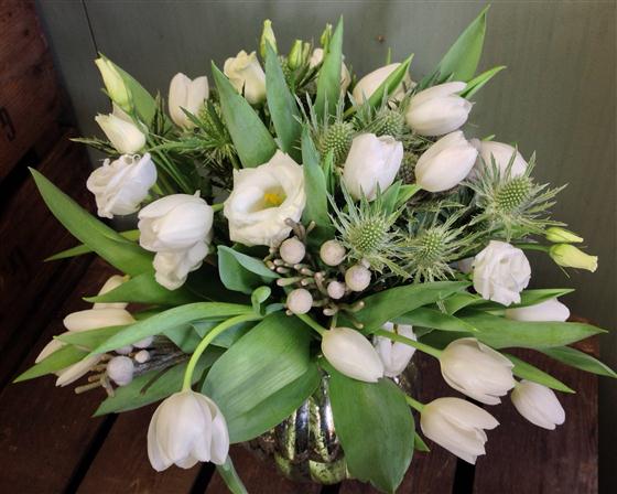 White tulips, white lisianthus, silver brunia and silver thistles. A perfect seasonal gift.