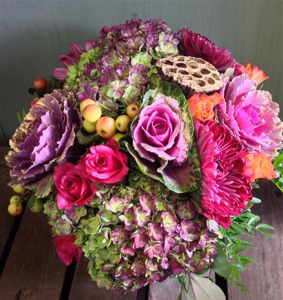 A rustic style bouquet in muted lilacs and striking pinks including roses and hydrangeas.
