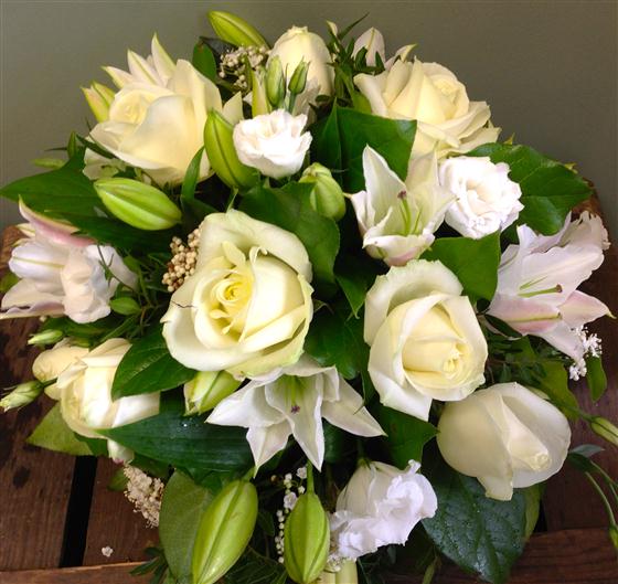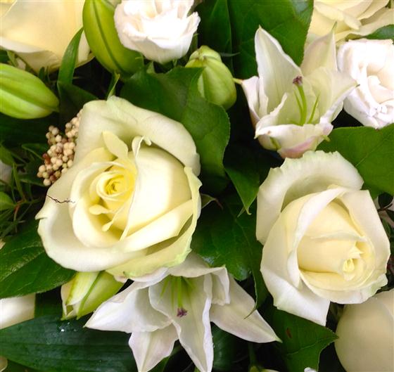A classic scented bouquet of white oriental lilies, roses and contrasting dark green foliage.