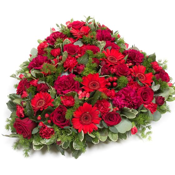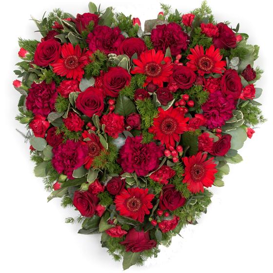 This striking red heart is created using a combination of seasonal foliage, hypericum berries and all red blooms.